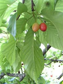 カンヒザクラが葉桜になり、実をつけてました。
