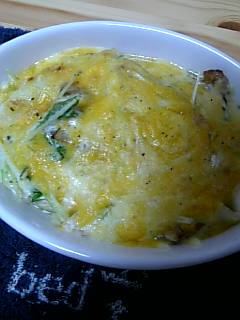 病み上がりなのに夜は「水菜とパスタのグラタン」作りました。